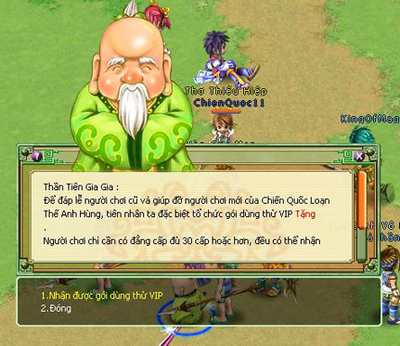 Có thể gặp Thần Tiên Gia Gia ở Tân Thủ Thôn (095, 125) hoặc Nước Chu (290, 175) để nhận gói VIP dùng thử này.
