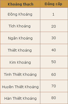 Khoáng thạch: Mỗi loại khoáng thạch yêu cầu đẳng cấp nghề nghiệp khác nhau để khai thác.