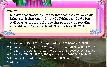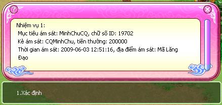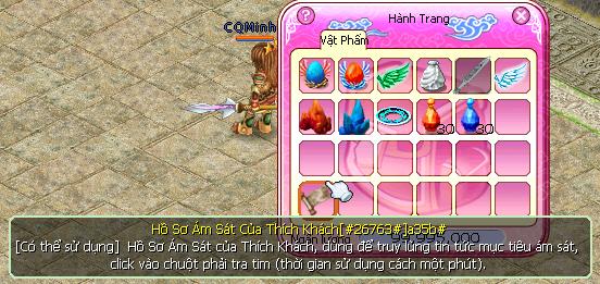 Sau khi nhận nhiệm vụ, người chơi kiểm tra trong hành trang sẽ thấy vật phẩm “Hồ Sơ Ám Sát Thích Khách”, khi click phải vào sẽ ghi thông tin chi tiết về nhân vật mình muốn ám sát đang ở tọa độ và bản đồ nào (60 giây sử dụng được 1 lần)