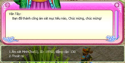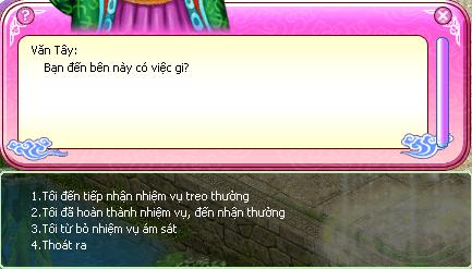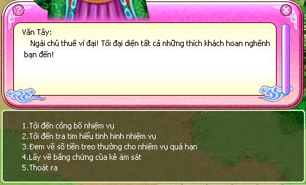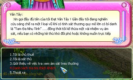 - Sau khi hoàn thành nhiệm vụ tiêu diệt được người chơi cần ám sát, đến gặp NPC Văn Tây chọn “Tôi đã hoàn thành nhiệm vụ, đến nhận thưởng” để nhận phần thưởng từ người Chủ thuê.