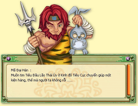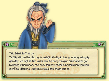 Tiêu Đầu Lão Thái Úy tính tình hào phóng, luôn muốn giúp đỡ người khác, bạn có thể đến gặp ông ta để nhận một số phi vụ bảo tiêu, nếu áp tiêu thành công bạn sẽ nhận được một khoản ngân lượng kha khá đấy.