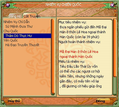Sau khi người chơi đạt cấp 30, có thể đến nước Chu gặp Tiêu Đầu Lão Thái Úy để tiếp nhận nhiệm vụ “Thăm dò thực hư”